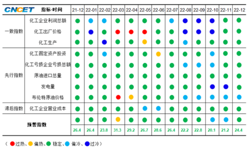 12月份化工行業(yè)綜合預(yù)警指數(shù)回升至綠燈區(qū)運(yùn)行,終值較11月份上漲3.2至24.4點(diǎn)。在構(gòu)成綜合預(yù)警指數(shù)的9個(gè)分指數(shù)中,化工產(chǎn)品價(jià)格和化工企業(yè)利潤(rùn)總額持續(xù)得到修復(fù),保持在綠燈區(qū)運(yùn)行;發(fā)電量企穩(wěn)回升,回升至綠燈區(qū)運(yùn)行;化工生產(chǎn)、化工固定資產(chǎn)投資、化工虧損企業(yè)虧損額、化工企業(yè)營(yíng)業(yè)成本和原油進(jìn)口量穩(wěn)定在綠燈區(qū)運(yùn)行;布倫特原油價(jià)格繼續(xù)在淺藍(lán)燈區(qū)運(yùn)行。具體顯示見(jiàn)圖3。