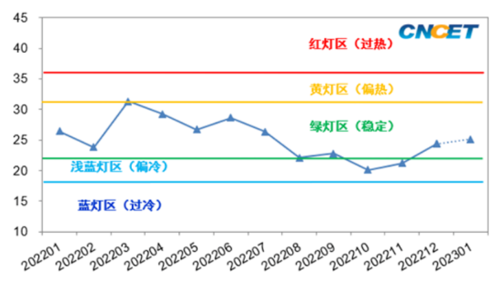 受國(guó)際原油連續(xù)兩個(gè)月走弱影響,利好石油加工業(yè)景氣度修復(fù),測(cè)算到1月份化工綜合預(yù)警指數(shù)初值為25.1,較12月份上漲0.6點(diǎn)。最近12個(gè)月中國(guó)化工行業(yè)綜合預(yù)警指數(shù)具體走勢(shì)見(jiàn)下圖。